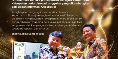 SIDOARJO, ELANGNUSANTARA – Pemerintah Kabupaten Sidoarjo kembali mencatatkan prestasi di tingkat nasional. Pada Selasa, (18/11) Kabupaten Sidoarjo dianugerahi penghargaan Bhumandala Kanaka (Emas) untuk kategori Pemerintah Kabupaten atas inovasi dari Badan Informasi Geospasial.